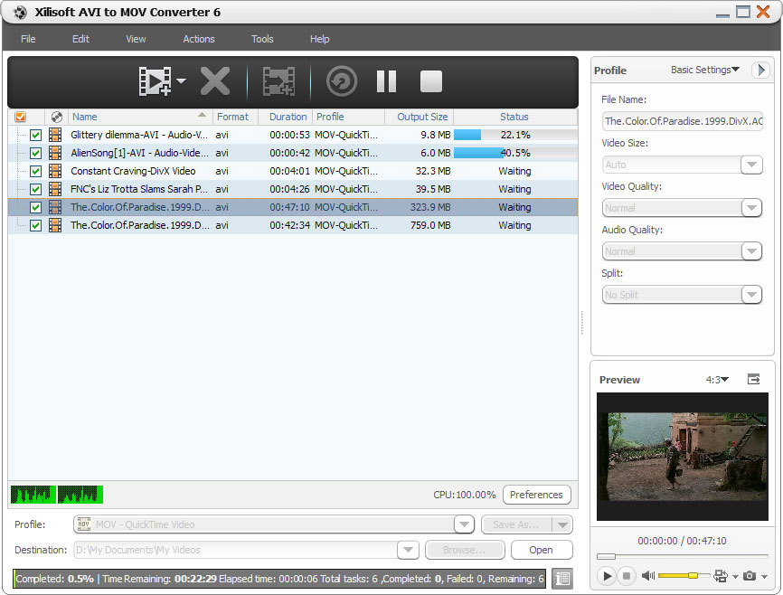 Xilisoft AVI to MOV Converter can help you convert AVI videos to QuickTime format (MOV), load as many files as you want and convert all at the same time.