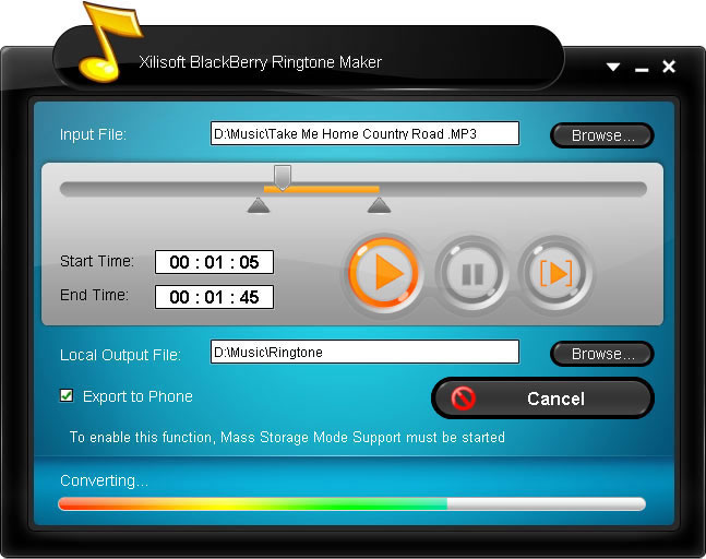 Furthermore, this BlackBerry Ringtone converter helps you cut wanted part from a video/audio file and convert it to MP3 file as a ringtone for your BlackBerry. Pre-listen to the ringtone, then make your own BlackBerry ringtone with Xilisoft BlackBerry Ringtone Maker in just one click.