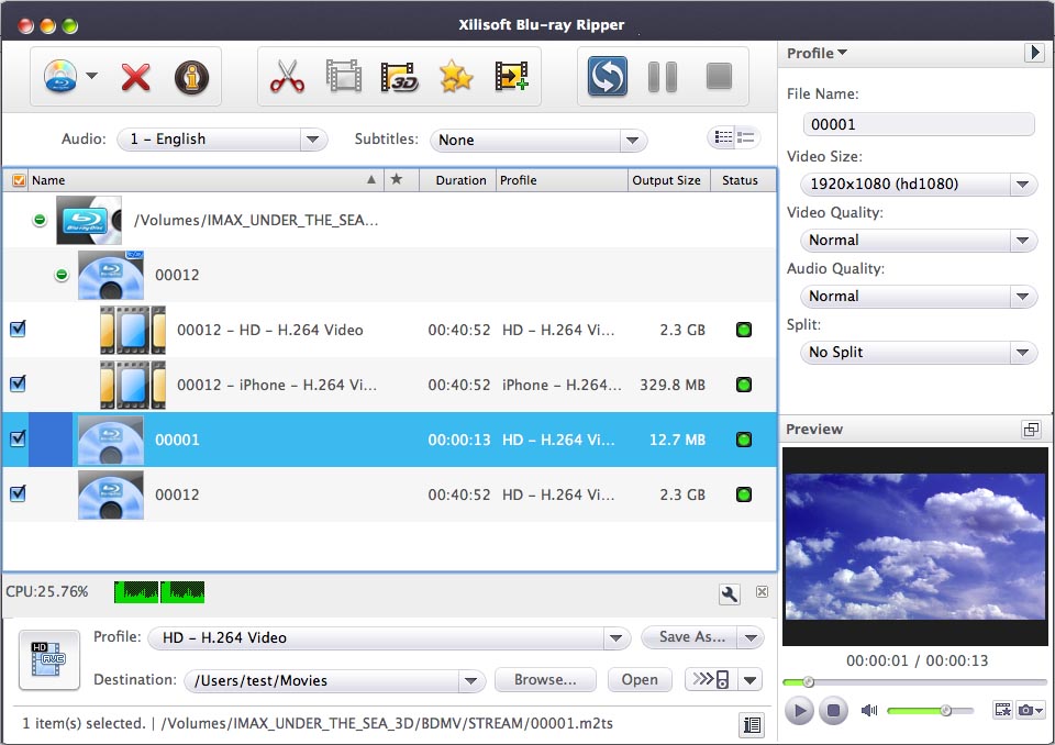Wanna watch Blu-ray movies without any Blu-ray player? Now, Xilisoft Blu-ray to Video Converter for Mac is designed to convert Blu-ray discs/M2TS and 3D Blu-ray disc/SSIF videos to the most popular videos like AVI, MPEG, WMV, DivX, MP4 formats and even High Definition videos in format of H.264/MPEG-4 AVC, Apple TV h.264 720P, HD WMV and etc. And it can convert 3D Blu-ray videos to other formats of 3D videos. With that, you can fully enjoy Blu-ray movies on your Mac, iPhone, iPad, etc.