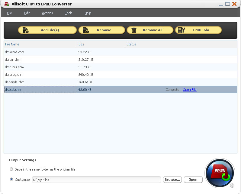 Xilisoft CHM to EPUB Converter is a useful converting tool to help users convert CHM files to EPUB format with ease to view on various mobile devices. It preserves original text, graphics, images, hyperlinks and layout of the original CHM files. Xilisoft CHM to EPUB Converter also allows you to edit information of EPUB files freely, such as name, author and etc, you can also add a cover to the EPUB eBook as you like. Convert CHM files to EPUB format with ease.