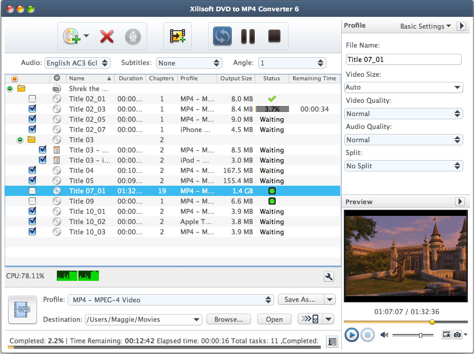 Especially designed for Mac users, Xilisoft DVD to MP4 Converter for Mac provides the best way to convert Home DVD to MP4 format for iPod, iPhone, iPad, Galaxy, Archos, iRiver PMP, Creative Zen, and Apple TV. You can also extract audio from Home DVD movie and convert Home DVD to MP3, AAC or M4A format with this Mac Home DVD to MP4 converter.