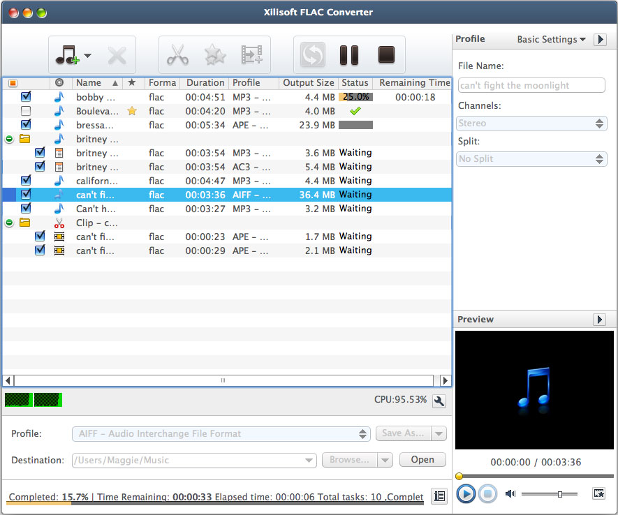 Xilisoft FLAC Converter for Mac is simple, fast and powerful software to convert FLAC(Free Lossless Audio Codec) audios into a variety of other audio formats with higher quality preserved. You can use Xilisoft FLAC Converter to reduce file size of FLAC audio to various audio formats like MP3, WMA, AAC, WAV, CDA, OGG, APE, CUE, M4A, RA, RAM, AC3, MP2, AIFF, AU, MPA, SUN AU and send them to your mobile devices.