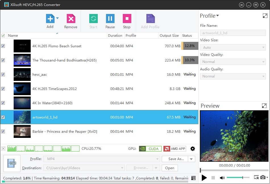Xilisoft HEVC/H.265 Converter converts your video files in high speed while maintaining the high audio and video quality.