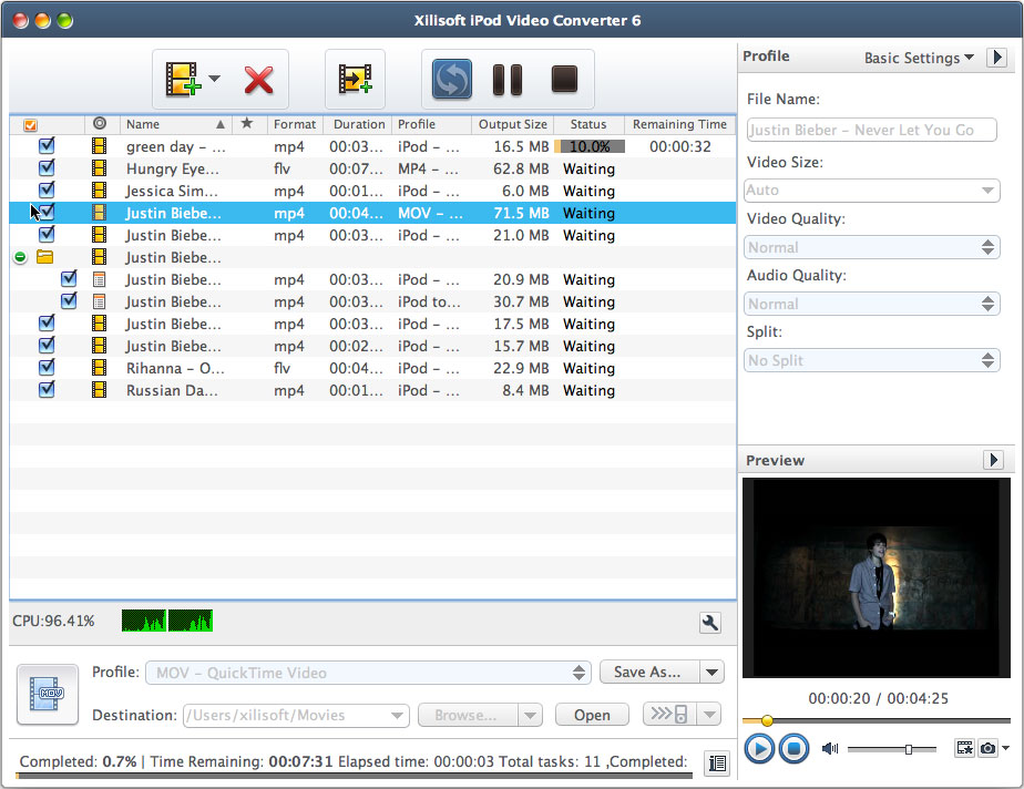 It can convert most popular video formats like AVI, MPEG, WMV, DivX and M4V to iPod format MP4 or MOV, and convert popular audio formats into iPod MP3 and M4A with Mac iPod video converter. Convert files in high speed while still maintaining the audio and video quality.