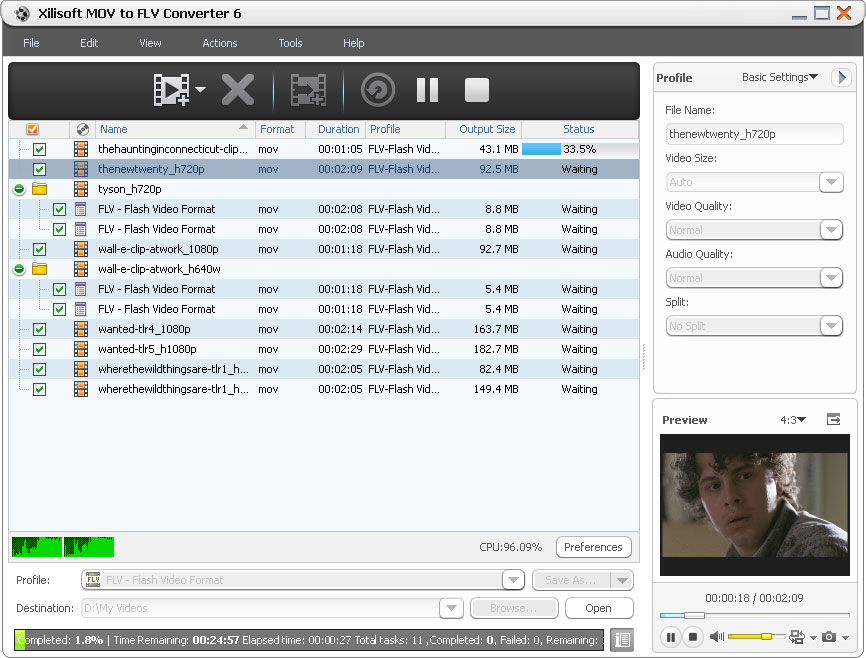 Split a large file to get several small FLV files, get the output file size you want using Bitrate Calculator, convert only your favored video segment, adjust the output parameters such as quality, codec, bit rate, frame rate, resolution and so on, and convert MOV to FLV video with custom resolution, file size and quality.