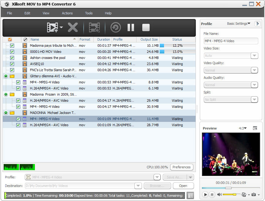 Xilisoft MOV to MP4 Converter offers you a perfect solution of how to playback QuickTime MOV video files on MP4 players. With this MOV to MP4 converter, you can easily convert MOV to MP4 video file, MOV to MPEG-4/H.264, QT to MP4 and QT to MPEG-4/H.264 in batches at high speeds on multi-core CPU.
