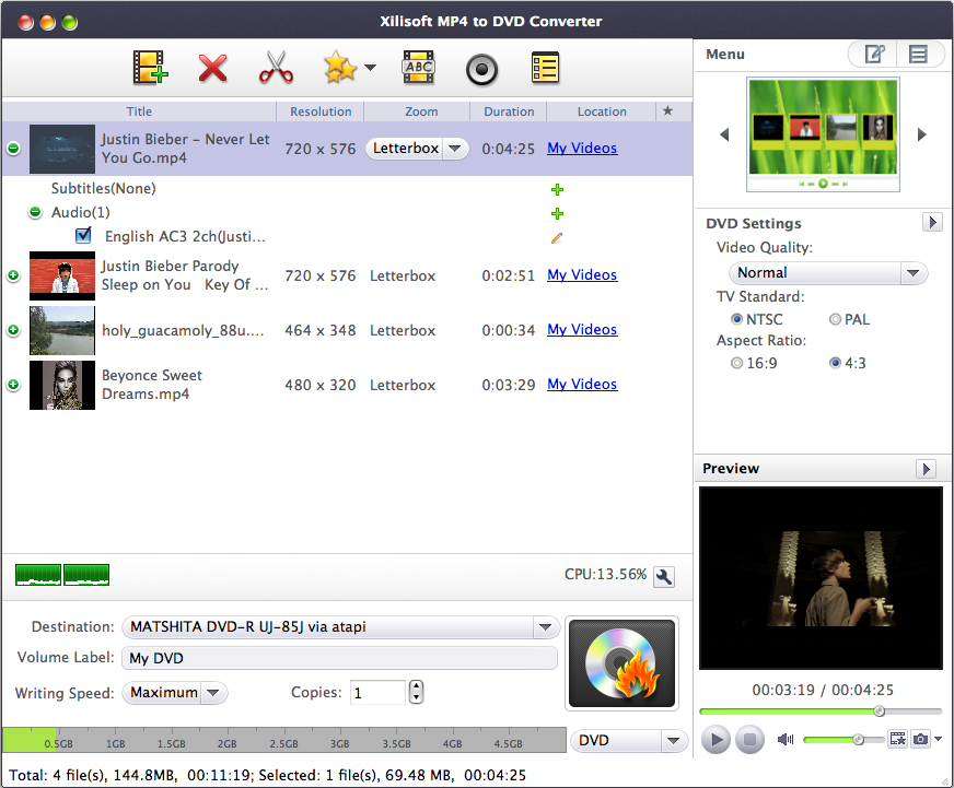 Xilisoft MP4 to Home DVD Converter for Mac can convert and burn MP4, MPEG, MPG, M2V, DAT, VOB, M4V, and H.264 videos to Home DVD discs, Home DVD folders or ISO image files on Mac effortlessly.