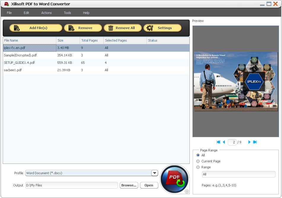 No need of Adobe Acrobat or Adobe Reader, Xilisoft PDF to Word Converter can convert PDF to Word files with all original features persevered to keep you from wasting hours reformatting. Besides, you can preview the PDF files in thumbnail mode and choose to convert several pages or the whole PDF files.