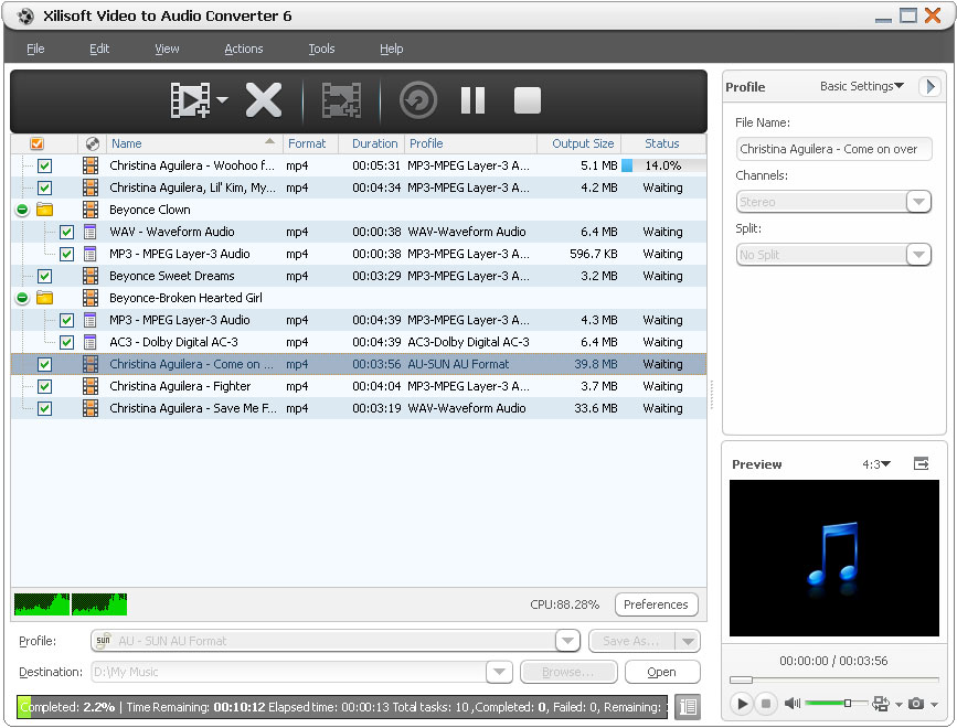 To extract a song or episode from a movie, you can have Xilisoft Video to Audio Converter to assist you. The professional video to audio converter can easily convert AVI video to MP3 as AVI to MP3 converter, convert WMV to MP3 as WMV to MP3 converter. With it, you can easily get MP3, WMA, WAV, RA, M4A, AAC, AC3, OGG or Sun AU audio from video AVI, MPEG, WMV, DivX, MP4, H.264/MPEG-4 AVC, RM, MOV, etc.